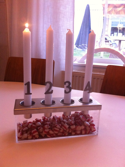 Fick ta mammas fina och enkla adventsstake i år, fylld med polkagrisar och siffror till ljusen. Vilken tur!